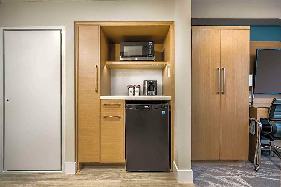 A mini fridge, microwave and work desk are offered in this spacious suite. A sofa bed, and a table with 2 chairs are provided in the separate lounge.